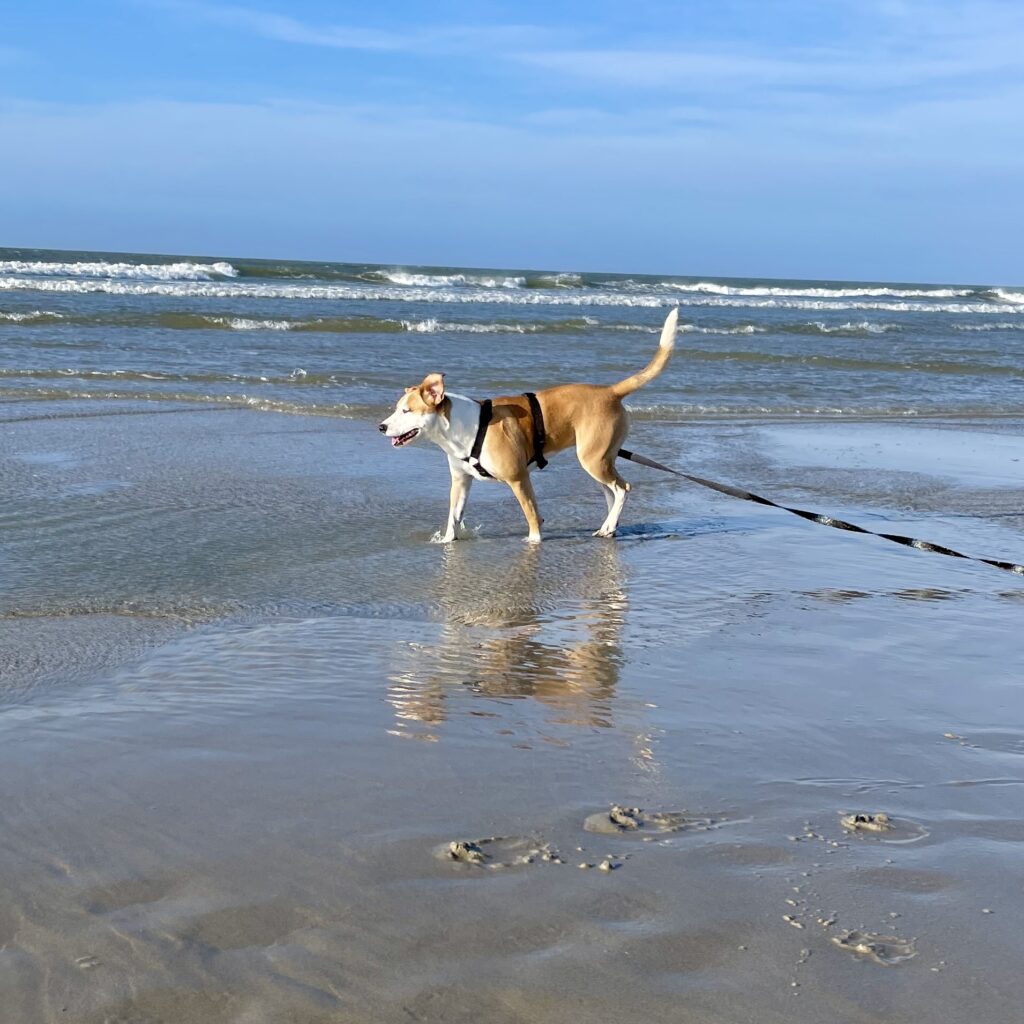 Aan de riem lopen doet Zus keurig, maar buiten heeft ze nog wel begeleiding nodig bij het passeren van andere honden. Er zijn ook honden waar ze dol op is. Zus heeft een voorkeur voor flinke stoere mannetjeshonden. Dan wordt ze heel enthousiast en speels. Dus een leuk stoer vriendje is welkom.